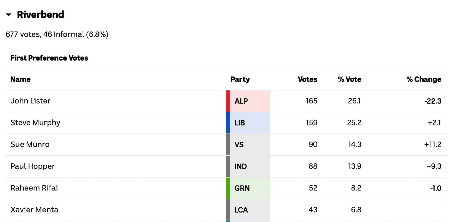 As of Sunday morning Sue’s tally was 2,897 votes, a very creditable 7.3% of the total, with almost all counting completed.